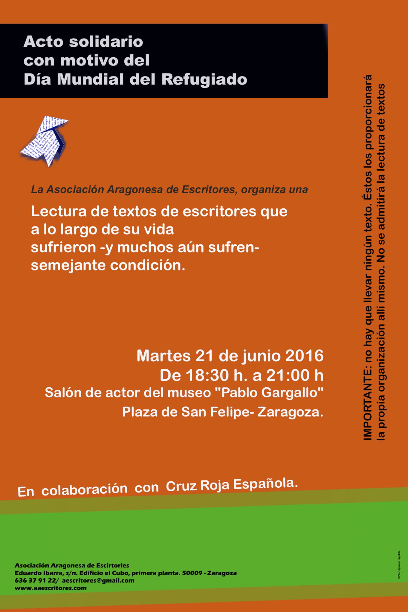 Esta entrada fue publicada en AAE y etiquetada Día Internacional del REfugiado. Guarda el enlace permanente.La Asociación Aragonesa de Escritores fue fundada en el mes de Junio de 2003, como fruto de la ilusión de un elevado número de escritores vinculados a Aragón y respondiendo a la necesidad de dar fuerza, información y difusión a sus obras. El 9 de febrero de 2004 la A.A.E se asocia con la Universidad de Zaragoza mediante convenio de colaboración.